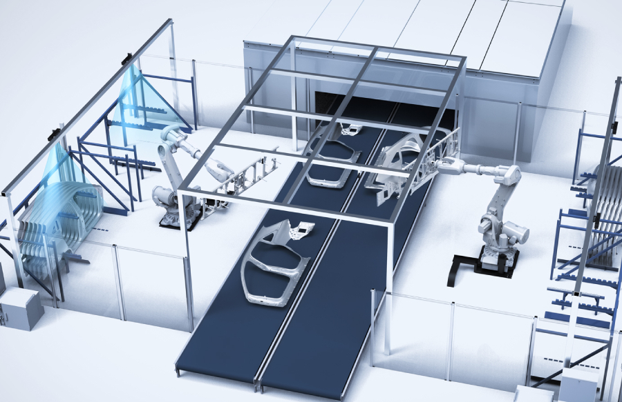 在汽車主機廠焊裝線體,通過引入AI+3D視覺,對車身件的型號、位姿進行判斷和糾偏,引導機械臂完成精準抓放。